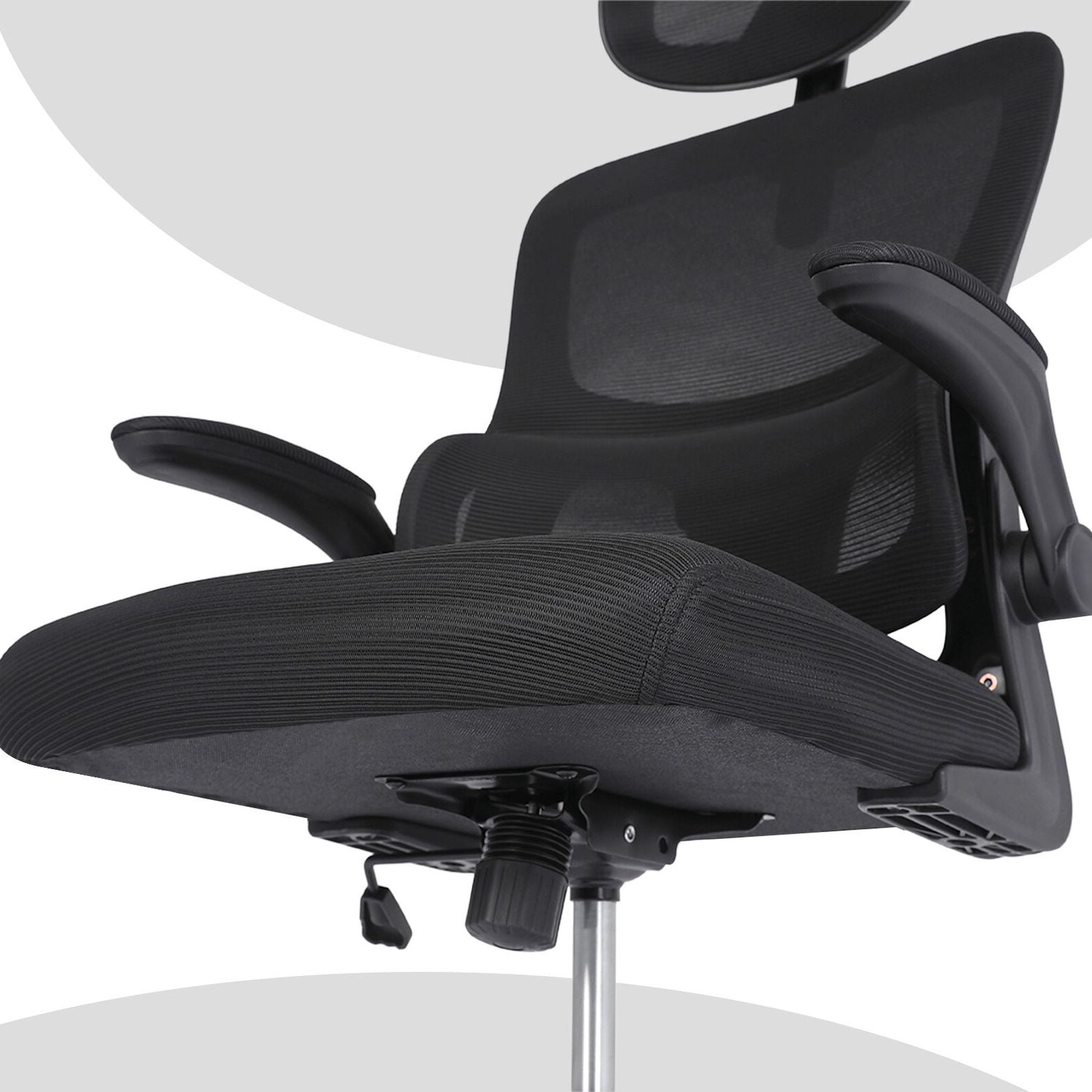 The office chair is designed to do just that. It quietly boosts your comfort while blending into your workspace. The breathable backrest keeps things cool, the built-in lumbar support has your back, literally. An adjustable headrest adds support when you lean in or sit back, while the flip-up arms give you more room when needed and let you tuck the chair neatly under your desk once the day is done.